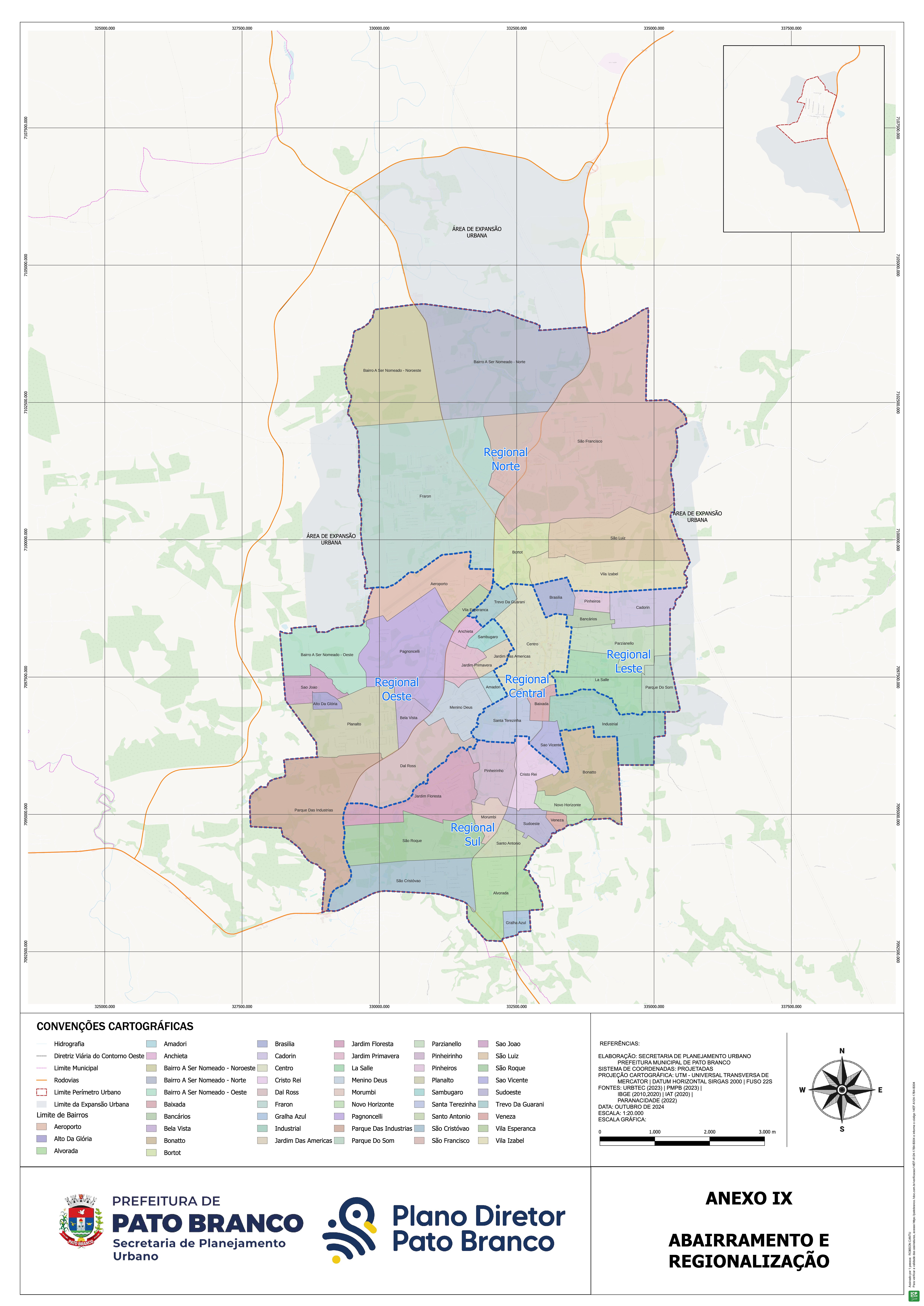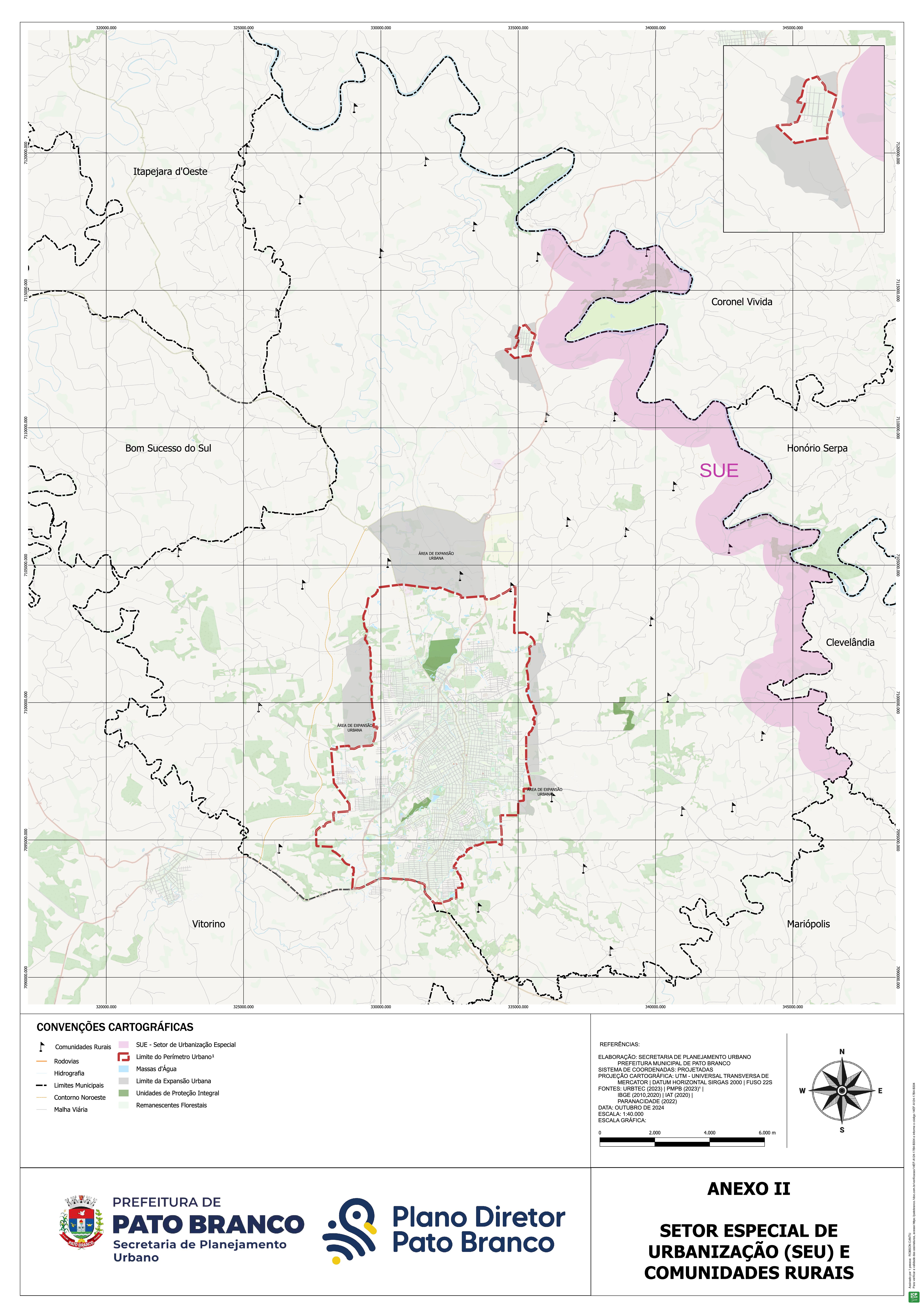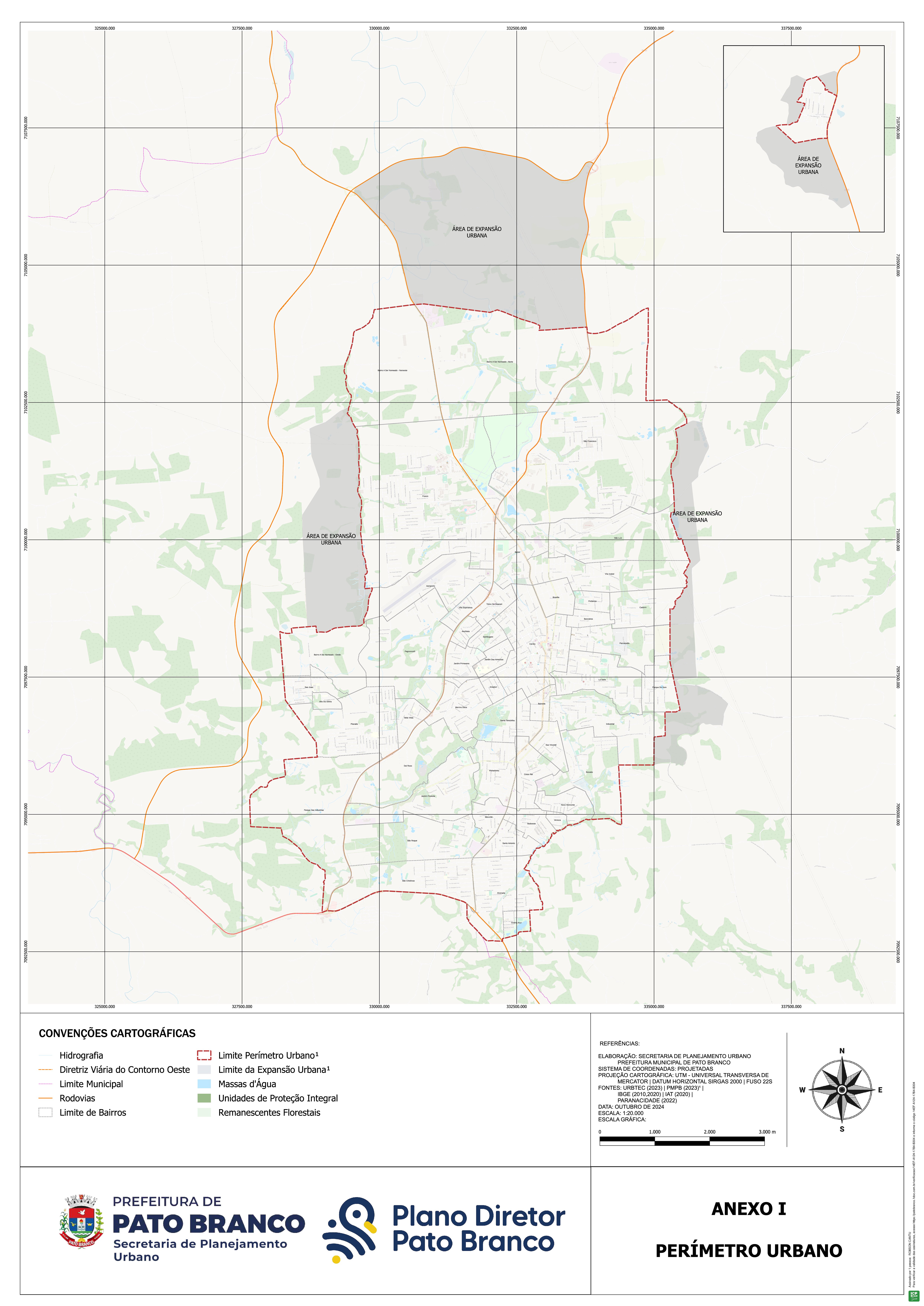 O perímetro da Sede Municipal de Pato Branco tem início no ponto P001, localizado sobre o curso d’água ID 8260, e desse segue em linha seca, por 909,488 m, com rumo nordeste, até o ponto PT003, localizado sobre a malha viária. (Neste trajeto, materializa-se o ponto PT002, localizado na Rodovia Vereado Pedro José da Silva). Do ponto PT003, segue em linha seca, por 1.213,312 m, com rumo sudeste, até o ponto PT004. Desse, ainda em linha seca, segue, por 139,800 m, com rumo nordeste até o ponto PT006. (Neste trajeto, materializa-se o ponto PT005, localizado sobre o curso d’água ID 10321). Do ponto PT006, segue em linha seca, por 827,808 m, com rumo sudeste, até o ponto PT007, localizado sobre a malha viária.